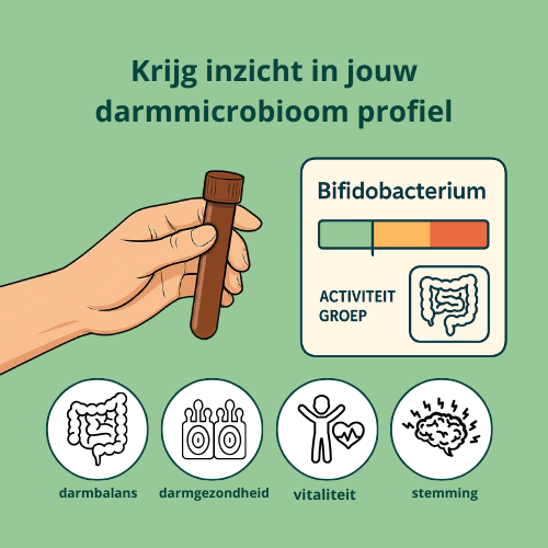 Deze uitgebreide darmbalans test brengt jouw persoonlijke microbioomprofiel in kaart. Zo ontdek je hoe jouw darmomgeving is opgebouwd en welke voeding en leefstijlfactoren mogelijk beter bij jou passen.