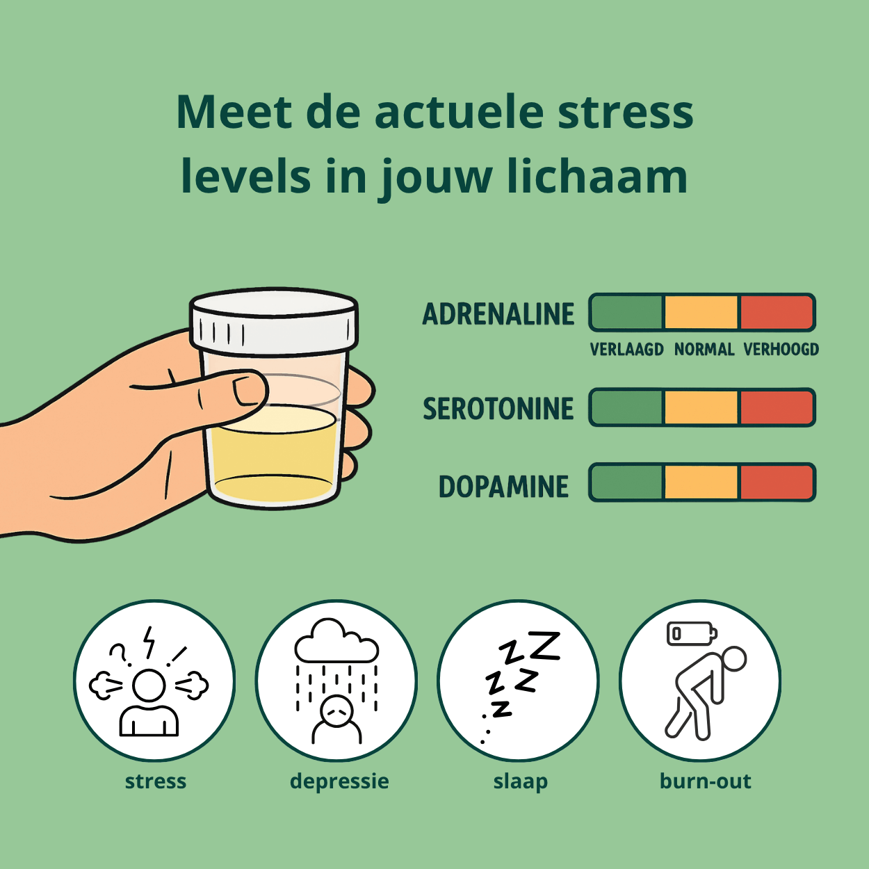 De test combineert urine- en speekselanalyse om een compleet beeld te geven van je neuro-endocriene stressprofiel.